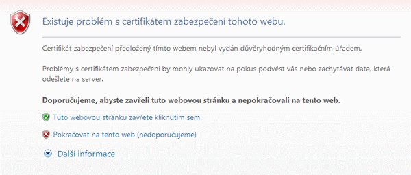 Před samotnou aktivací účtu doporučujeme provést instalaci certifikátu certifikační autority. Při prvním přístupu na stránky mex2 se totiž zpravidla zobrazí následující varovné hlášení.